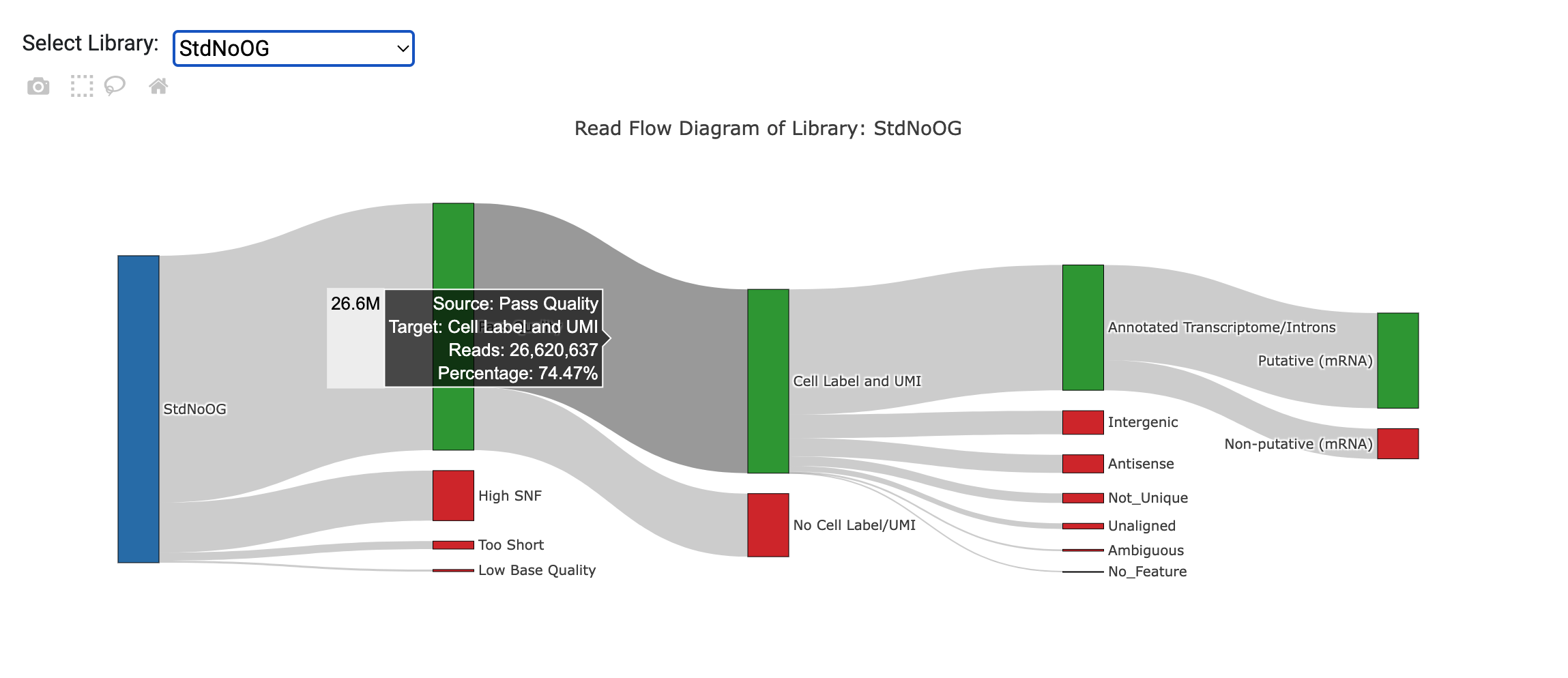 The Read Flow Diagram displays an interactive visualization of how reads are being filtered at various steps of the pipeline. A plot is generated for each library. If more than one library exists under the same library category (i.e. ATAC or Bioproducts), then a combined stats plot will also be generated. Hovering the mouse on nodes or flows will show a tooltip with detailed statistics (read counts, percentage). The putative cell step is only available in the combined plots, since all reads for a library category are combined at that point.
